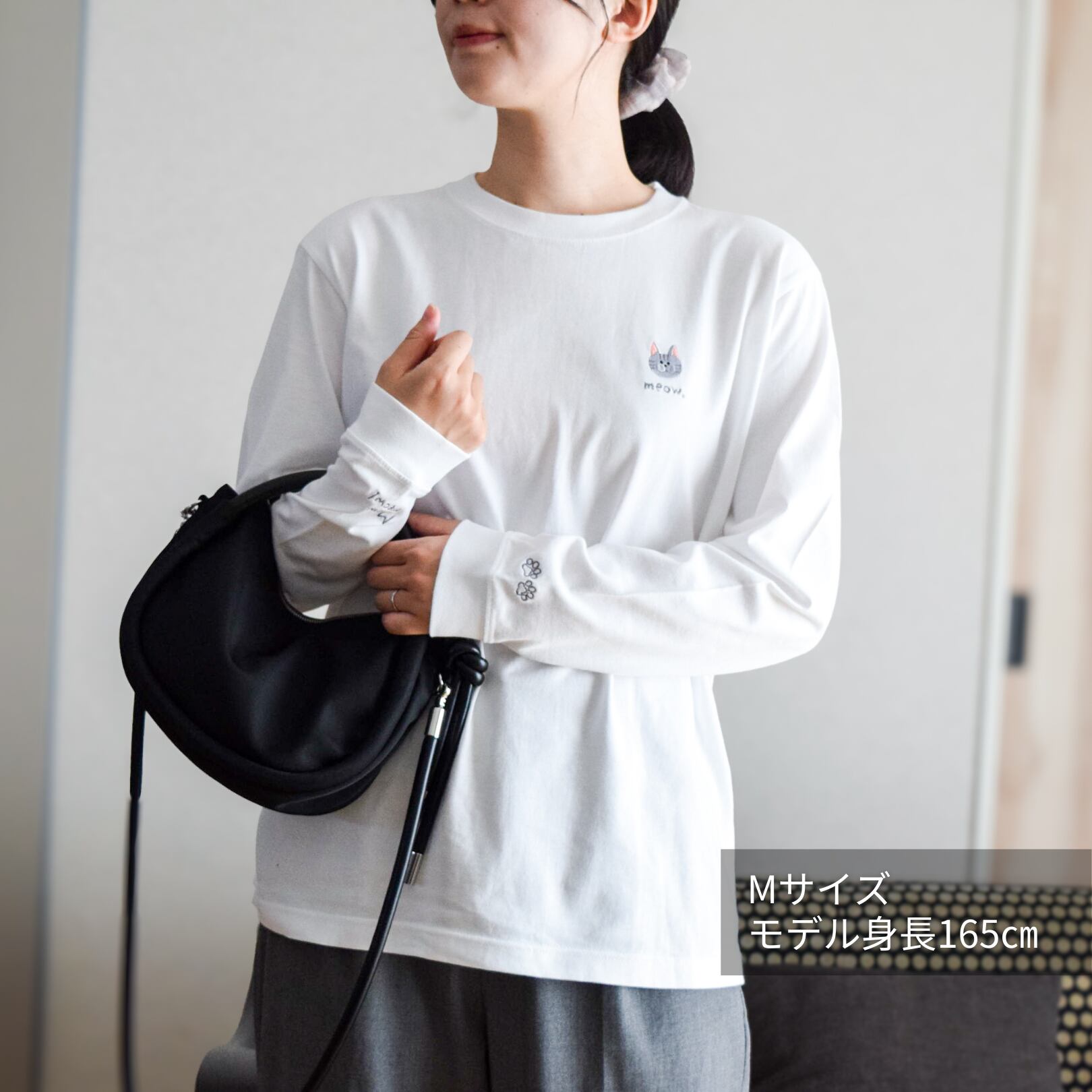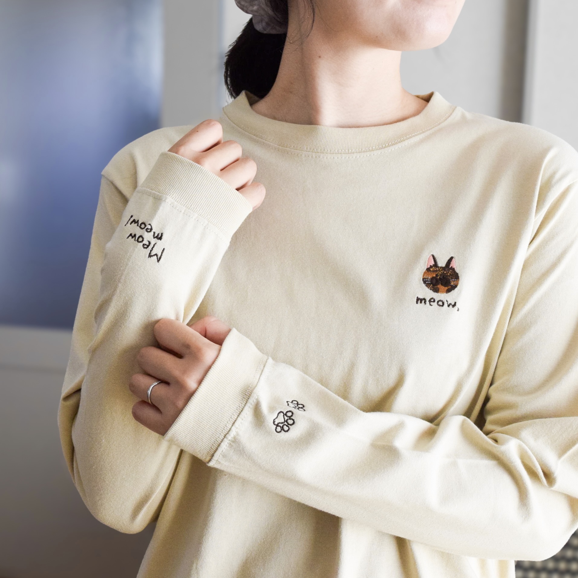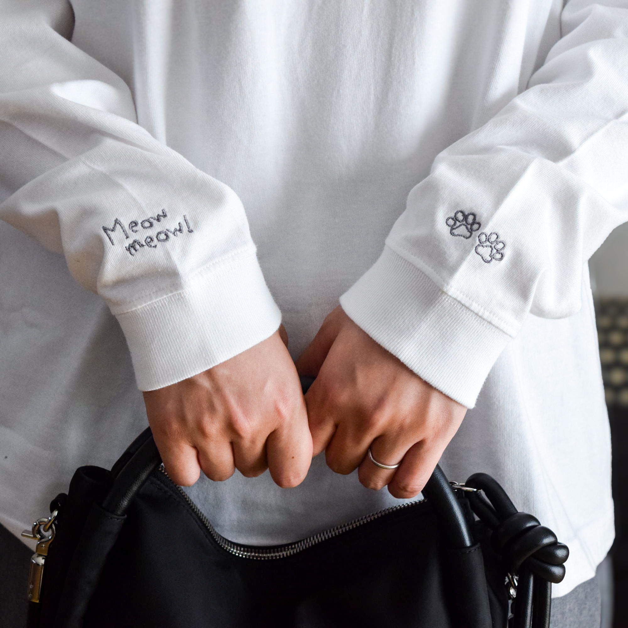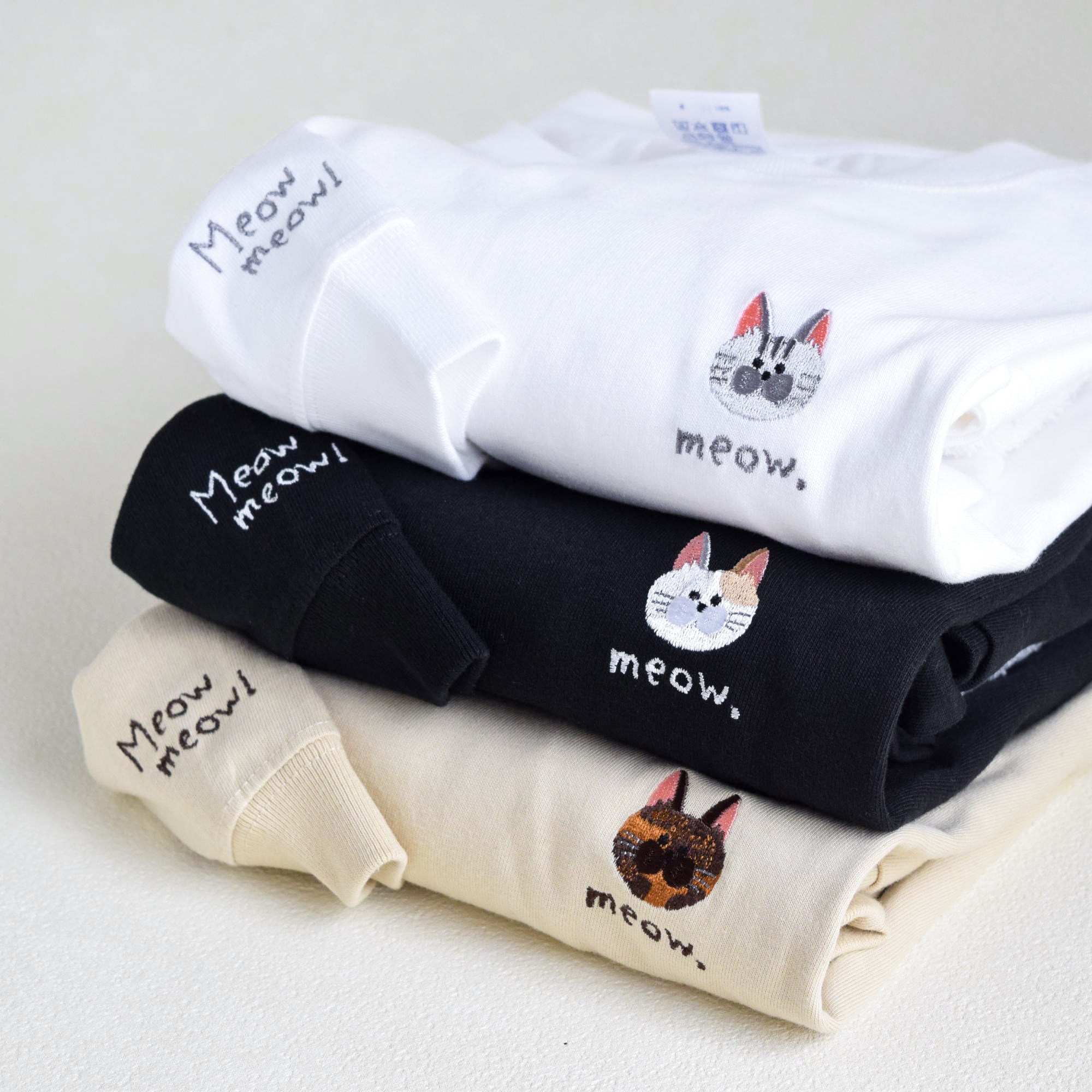 肉球の刺繍と、ニャンコの鳴き声「Meowmeow!」のロゴ刺繍をあしらいました