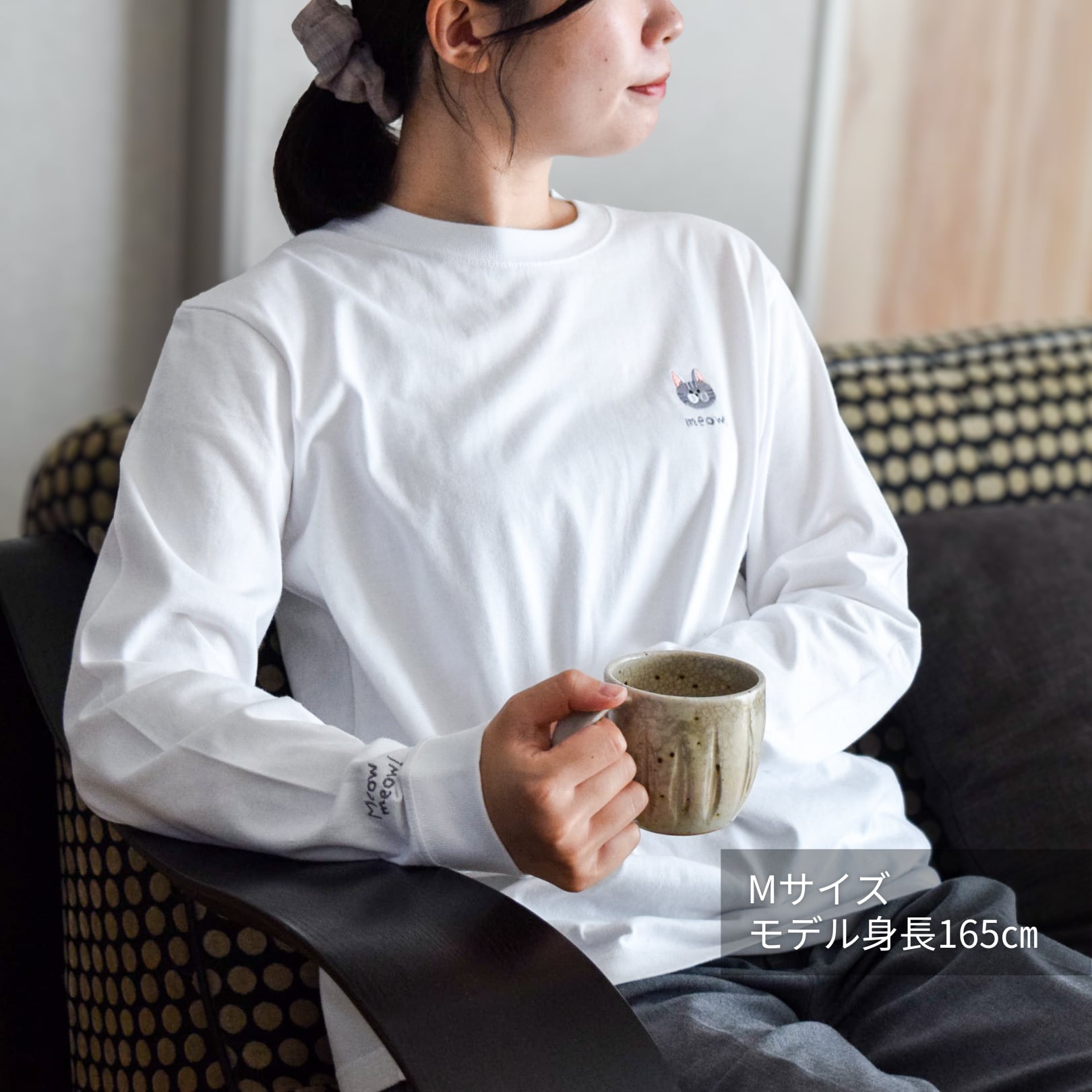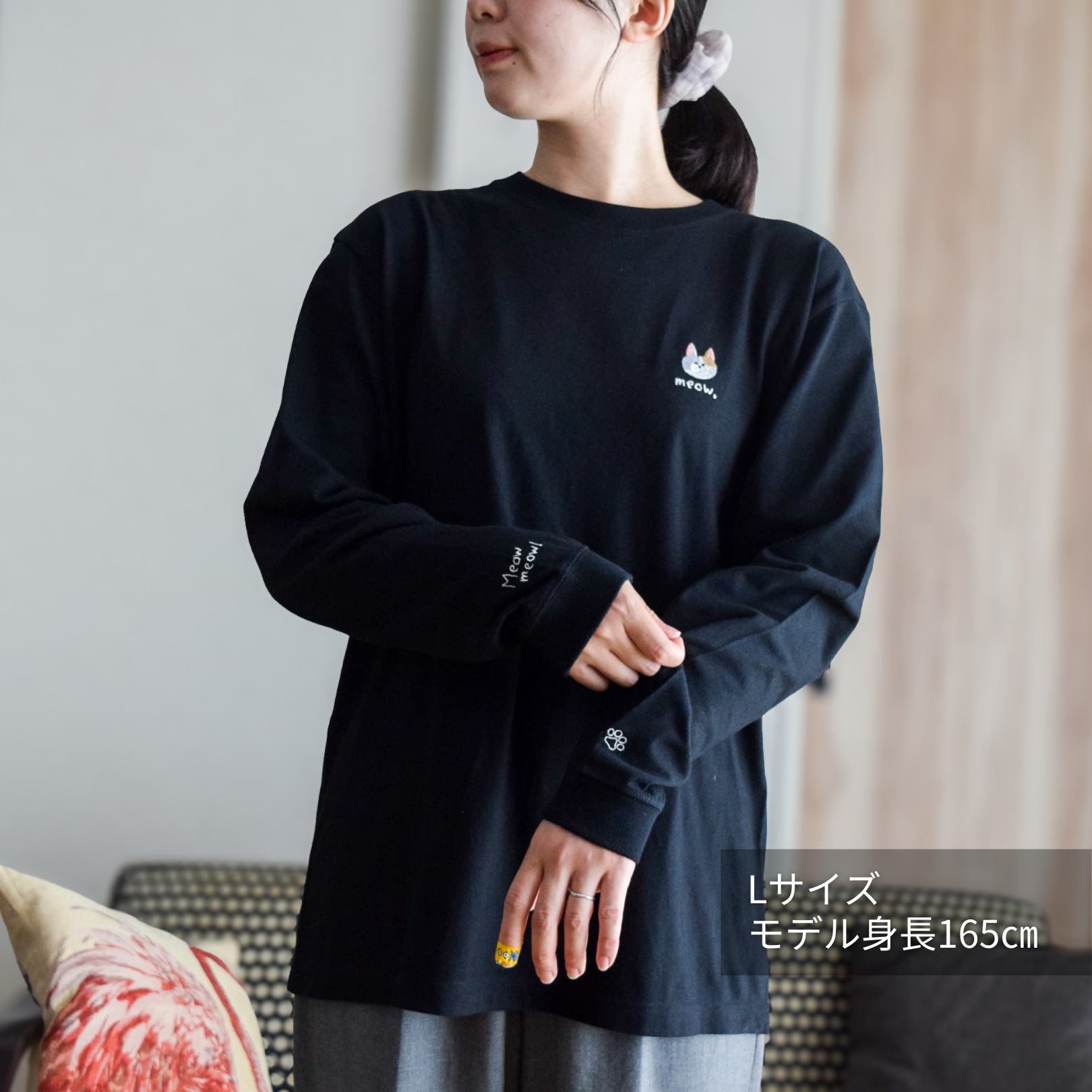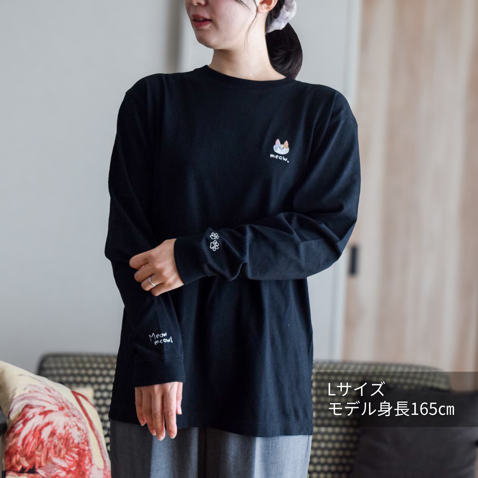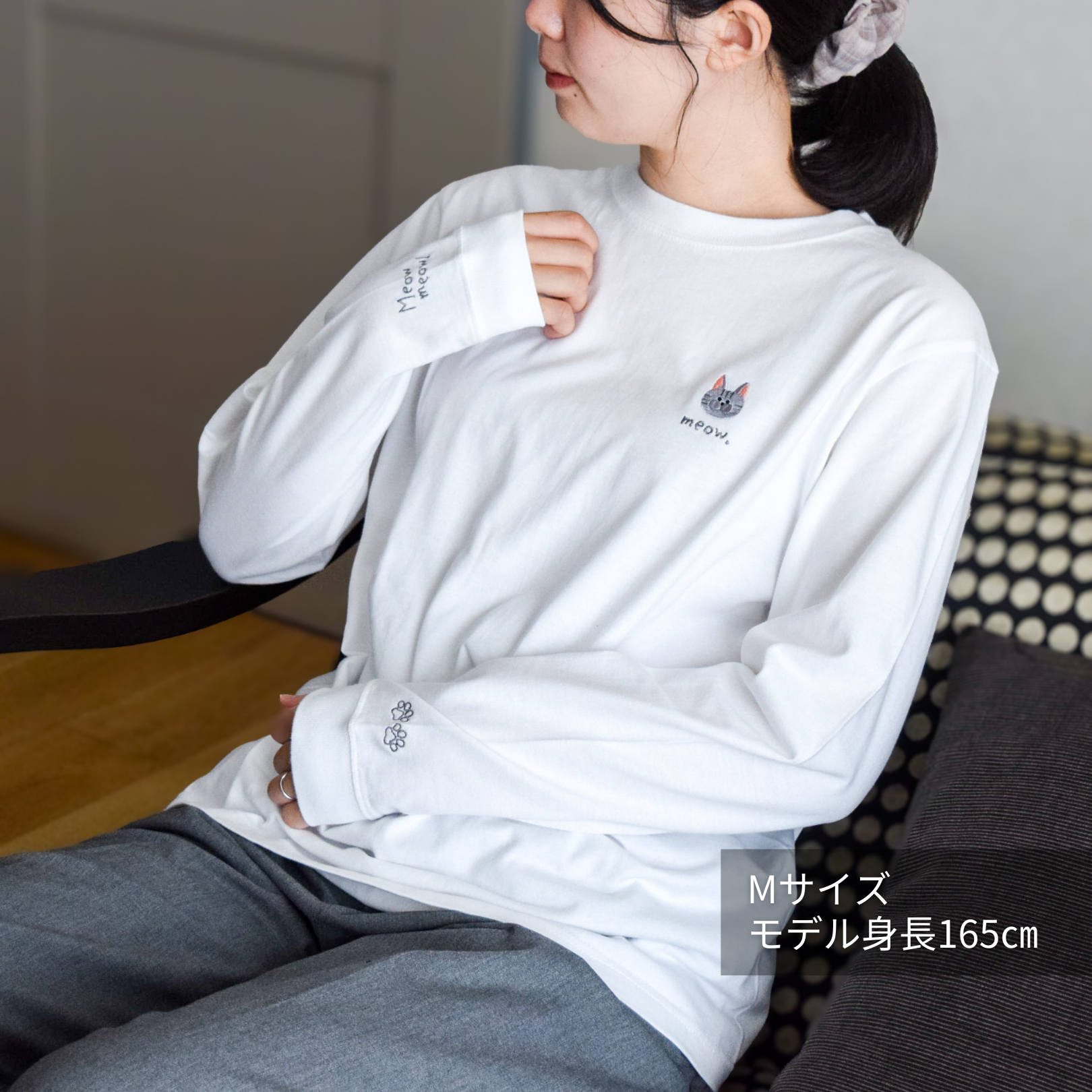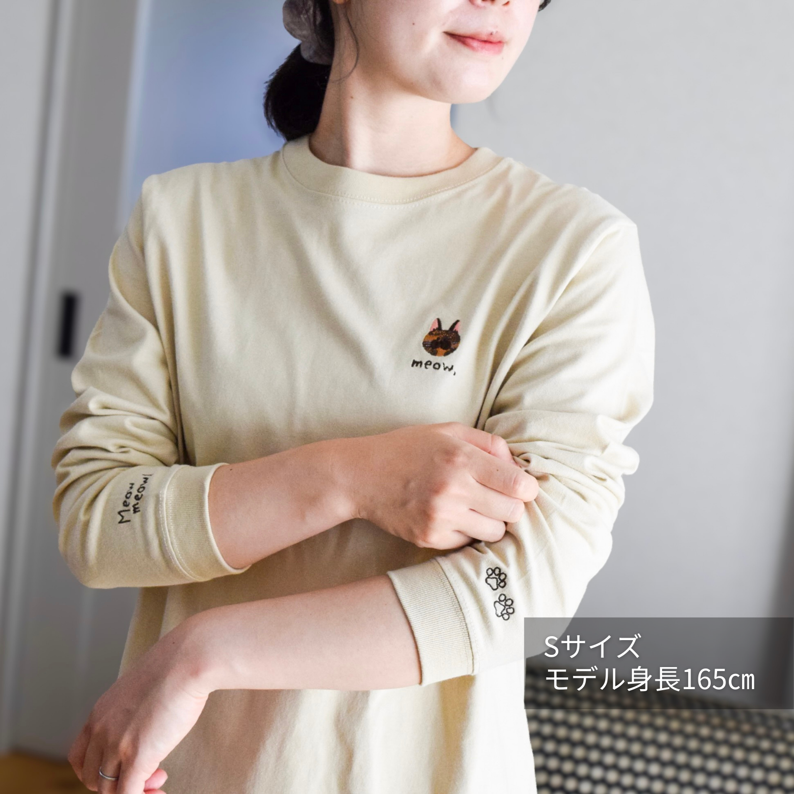 肉球の刺繍と、ニャンコの鳴き声「Meowmeow!」のロゴ刺繍をあしらいました