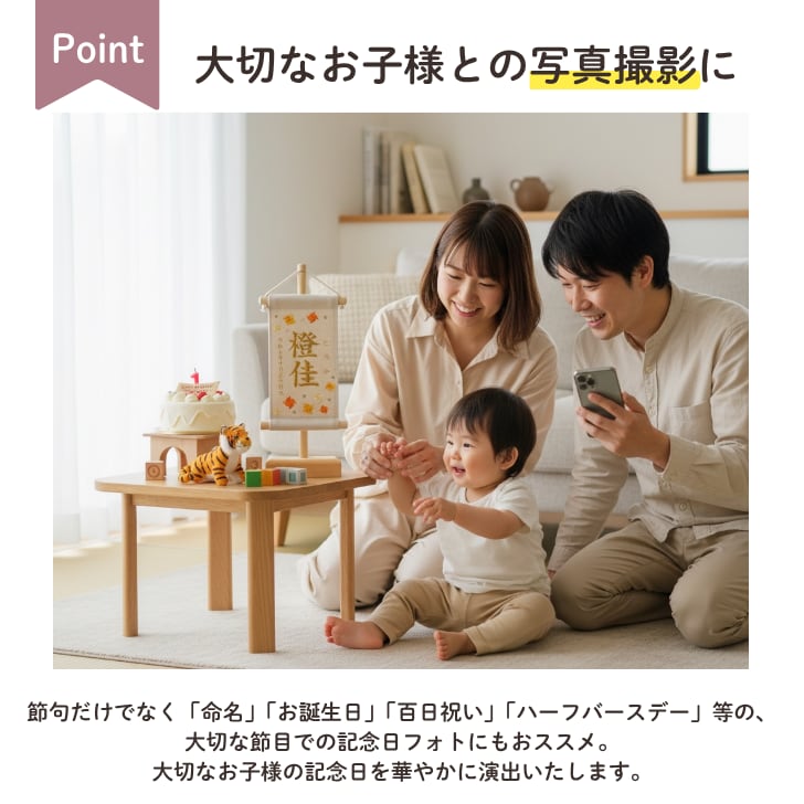 「命名」「お誕生日」「お食い初め(百日祝い)」「ハーフバースデー」「七五三」「お七夜」等の、大切な節目での記念日フォトにもおススメ