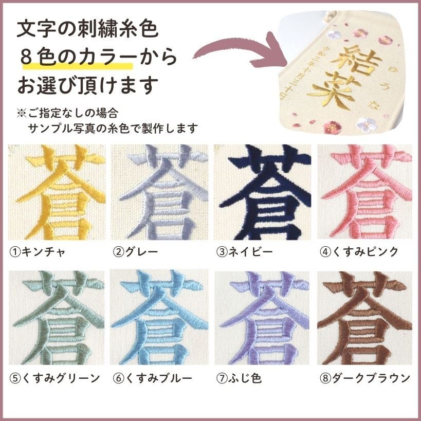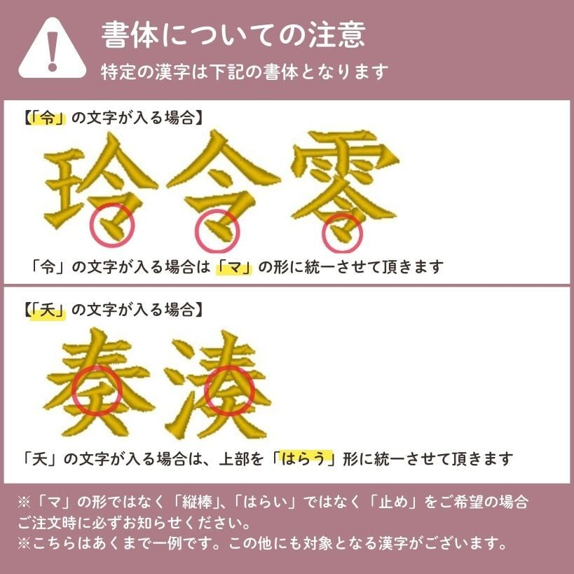 ※刺繍のバランス、見た目の美しさを重視した刺繍を行っておりますので、実際の漢字の筆順と異なる場合がございます