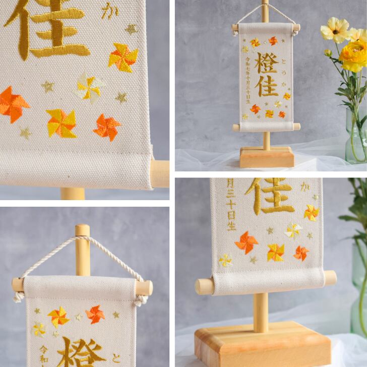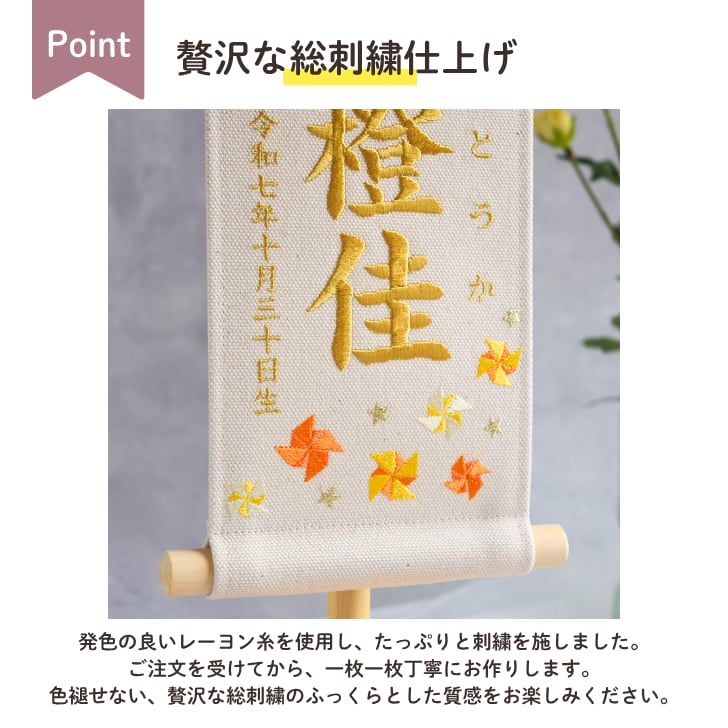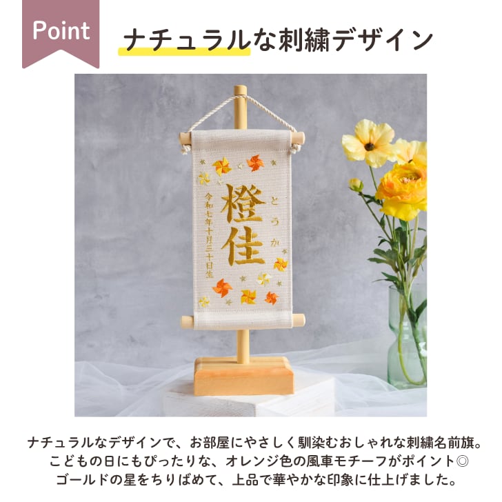 【スタンド付】刺繍名前旗【オレンジ風車|オフホワイト|小サイズ】命名書 出産祝い こどもの日 五月人形 端午の節句 男の子