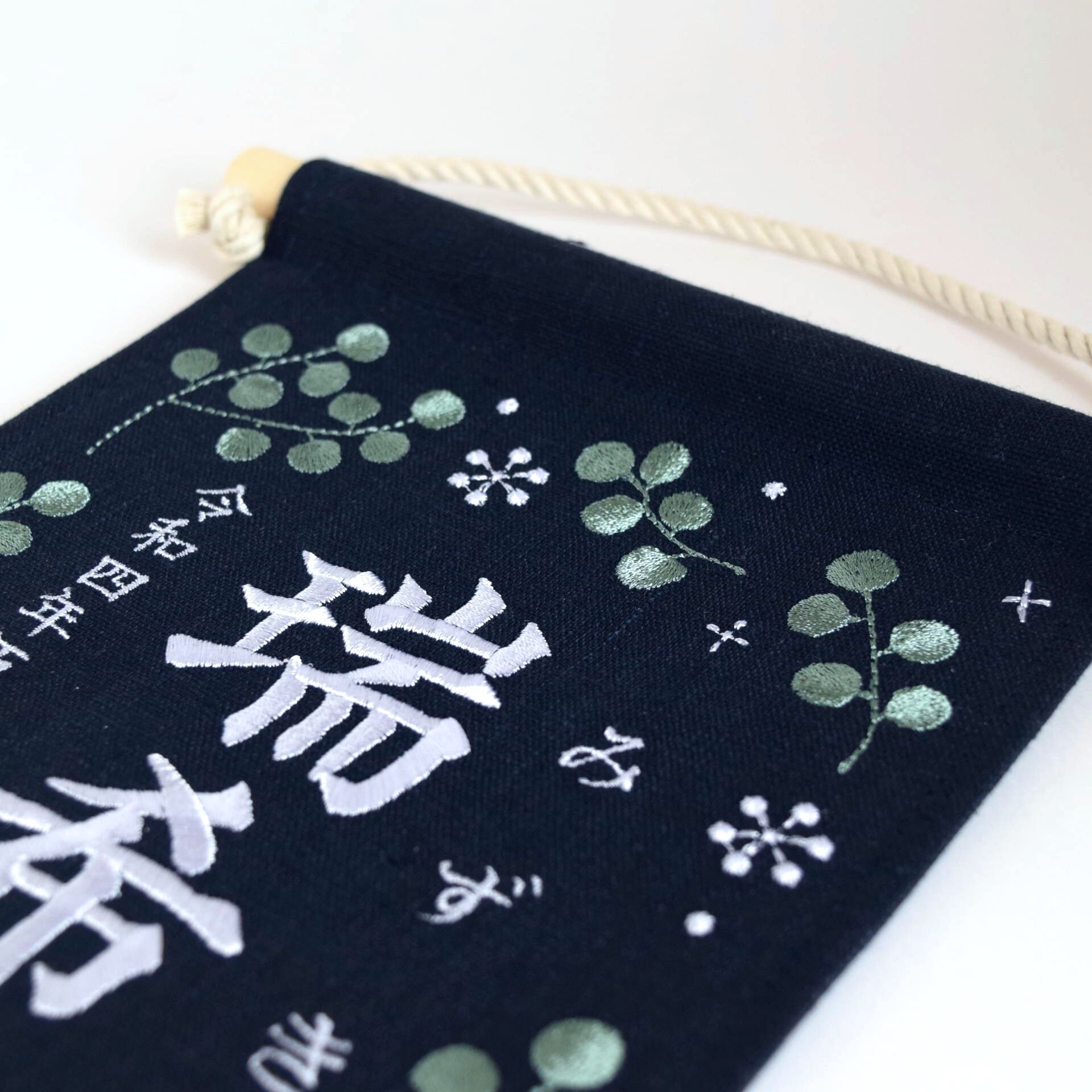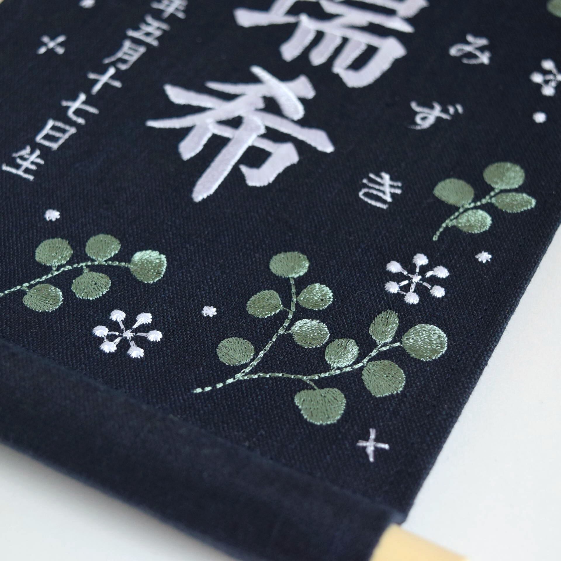 【スタンド付】小さな刺繍命名タペストリー《ユーカリ / ネイビー》名前旗 命名書 こどもの日 端午の節句