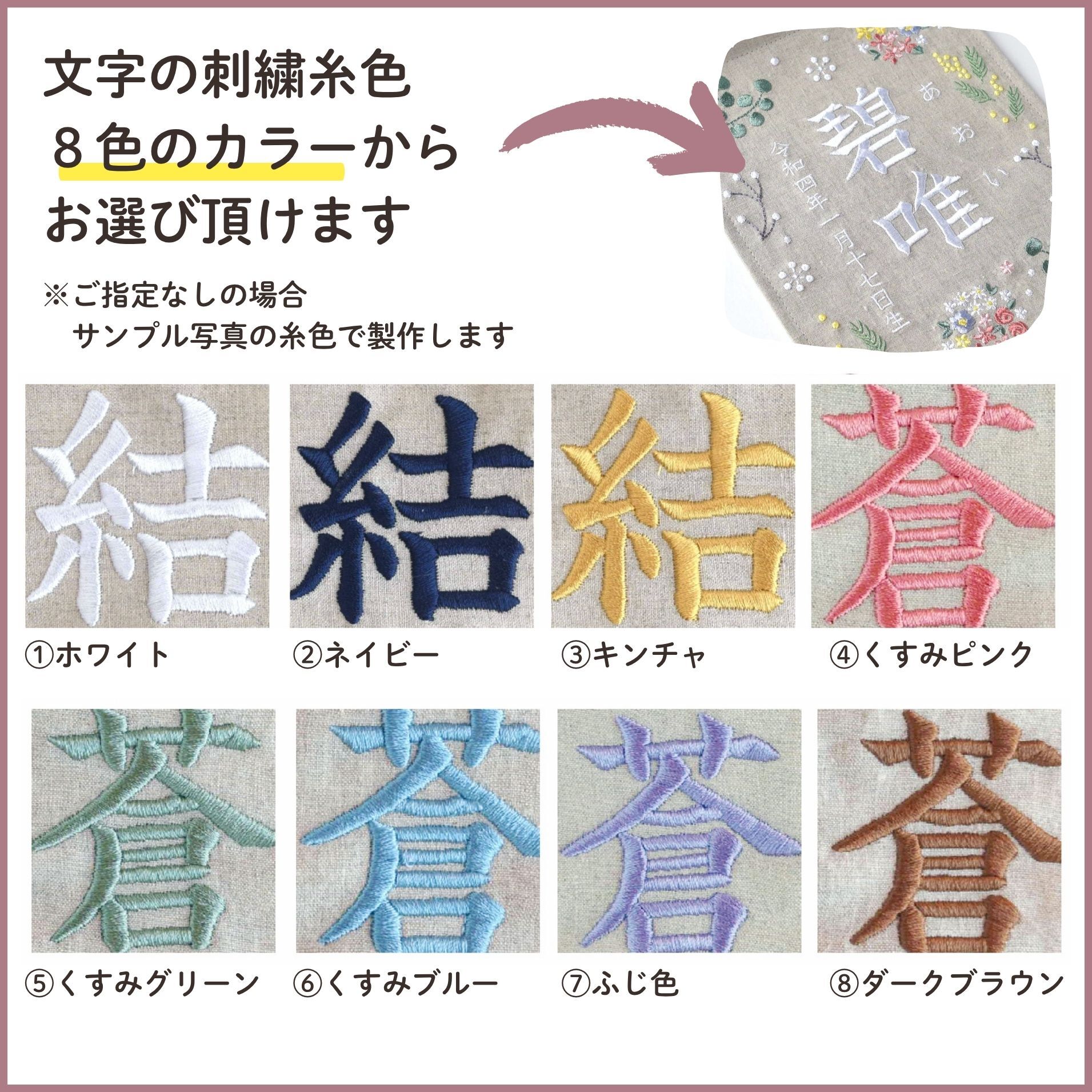 ※刺繍のバランス、見た目の美しさを重視した刺繍を行っておりますので、実際の漢字の筆順と異なる場合がございます