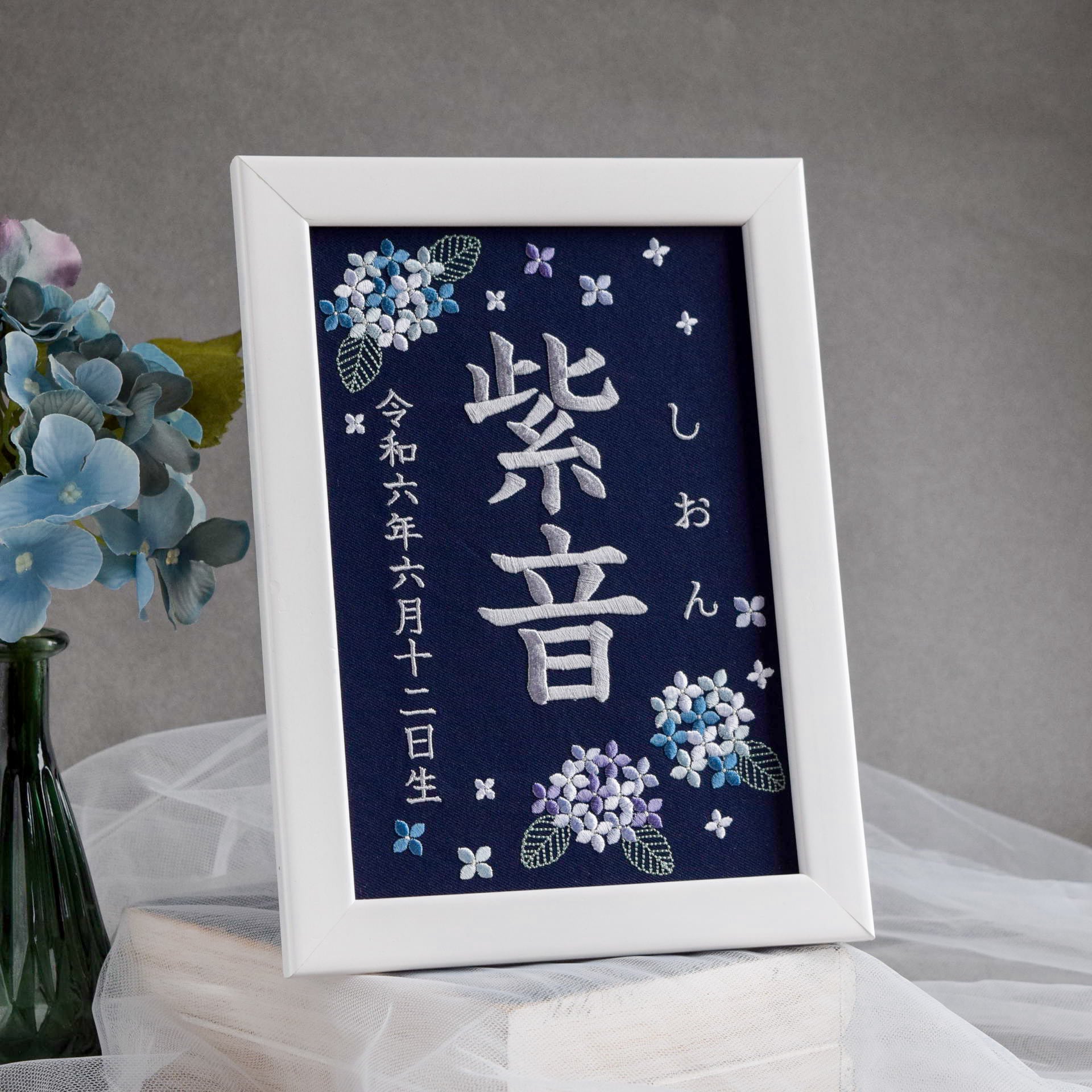 刺繍命名ボード《紫陽花 / ネイビー》A5サイズ 名前旗 出産祝い 夏 命名書 ひな祭り こどもの日 お七夜