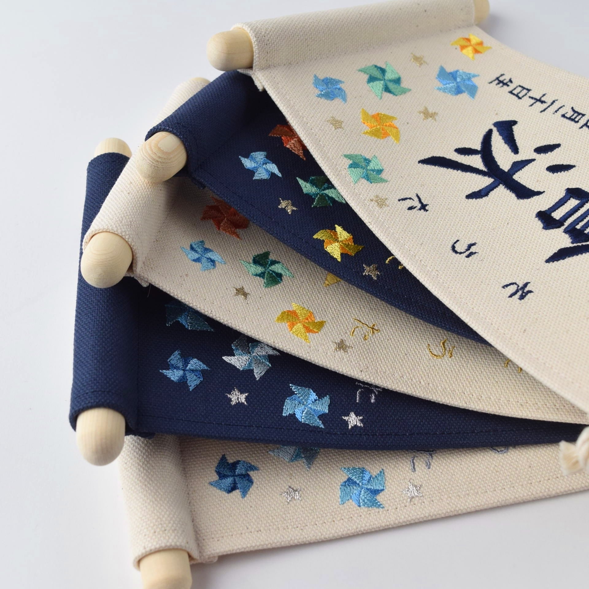 【スタンド付】小さな刺繍命名タペストリー《カラフル風車 / 小サイズ》名前旗 命名書 出産祝い こどもの日 五月人形 端午の節句
