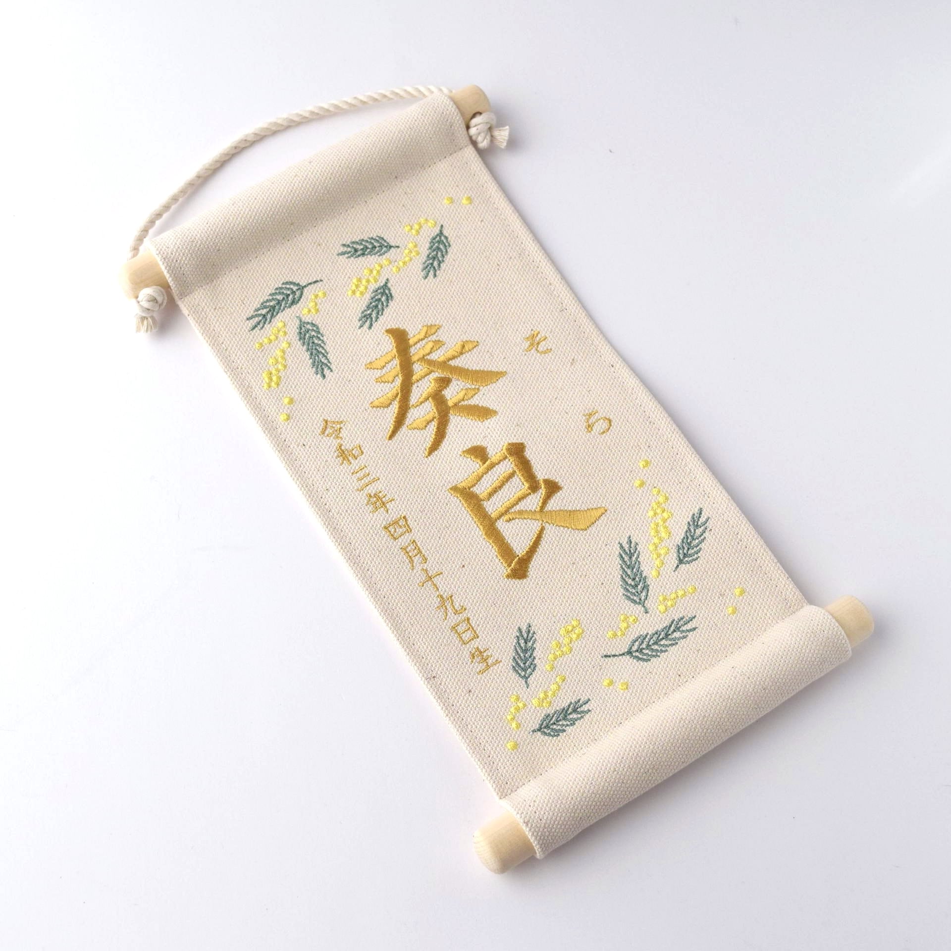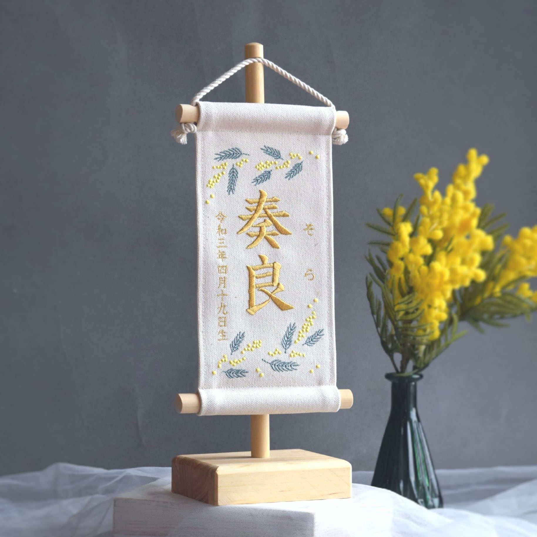 【スタンド付】小さな刺繍命名タペストリー《ミモザ / 小サイズ》名前旗 命名書 出産祝い こどもの日 五月人形 端午の節句 ひな祭り 桃の節句
