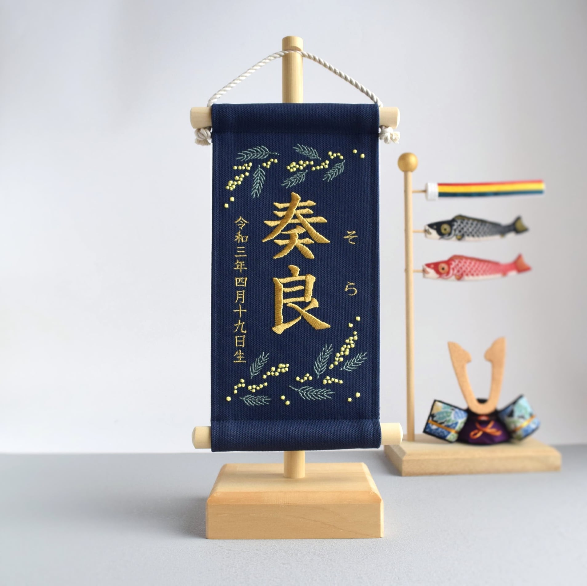【スタンド付】小さな刺繍命名タペストリー《ミモザ / ネイビー / 小サイズ》名前旗 命名書 出産祝い こどもの日 五月人形 端午の節句 桃の節句 ひな祭り