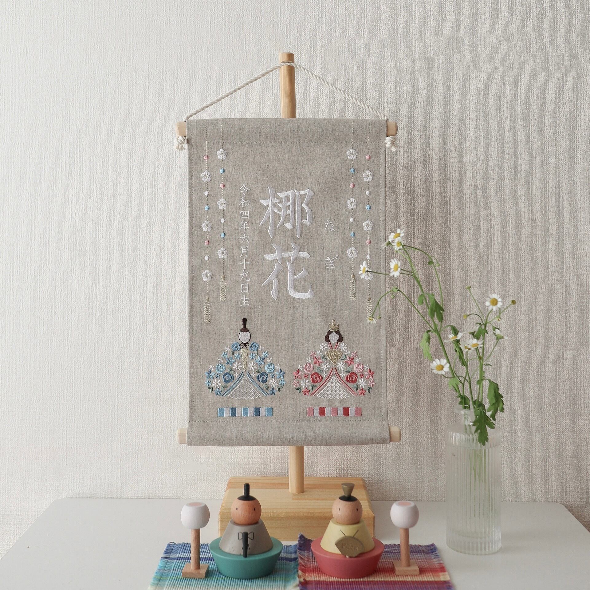 【2024新作】刺繍命名タペストリー《ひな祭り / ベージュグレー / 大サイズ》名前旗 出産祝い リネン 桃の節句 ひな人形