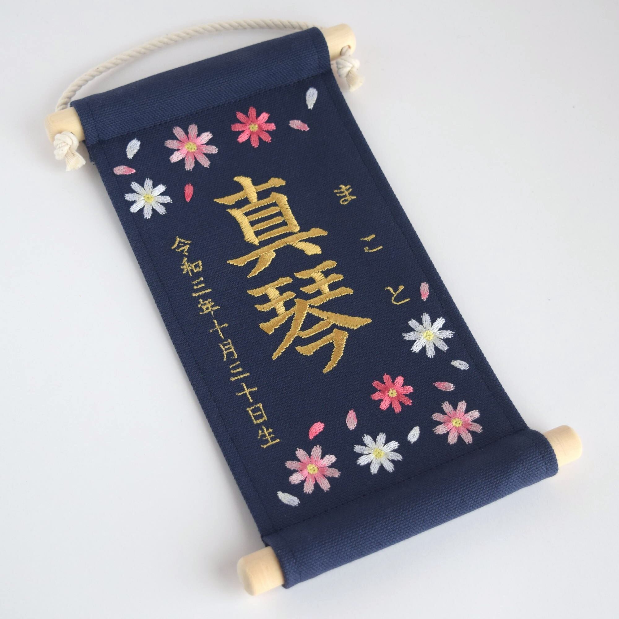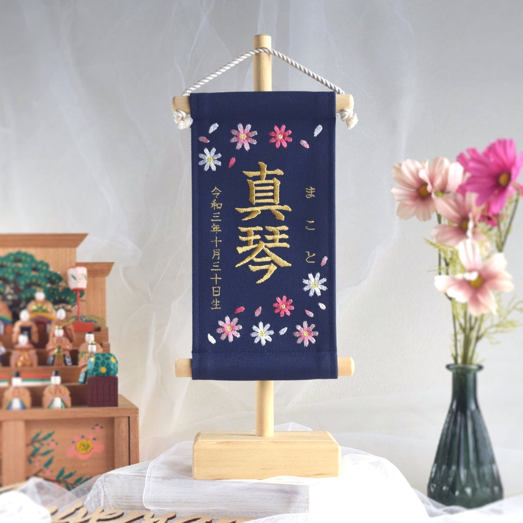 【スタンド付】小さな刺繍命名タペストリー《コスモス/ネイビー/小サイズ》名前旗 命名書 出産祝い こどもの日 五月人形 端午の節句
